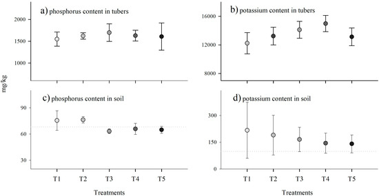 Averages with their respective standard deviations for each treatment: (a) phosphorus content and (b) potassium content in tubers, (c) phosphorus content, and (d) potassium content in soils at the end of harvest. Gray dotted lines show the soil’s initial phosphorus and potassium levels. Darker shades of gray represent higher levels of G. iranicum.