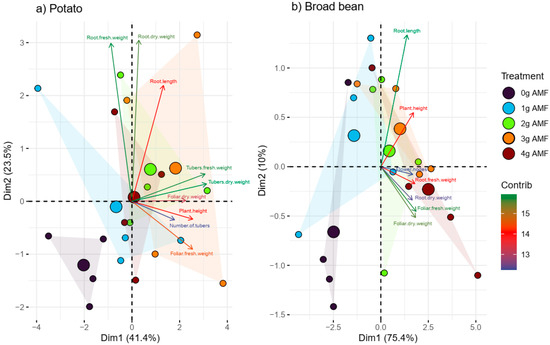 Principal component analysis (a) using potato plants and (b) broad beans with different doses of biostimulant. The parameters evaluated are shown in the figures.