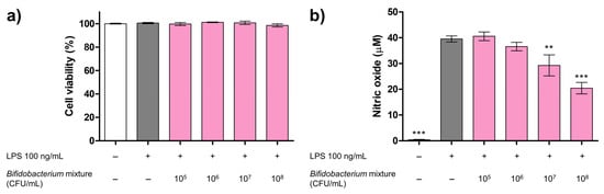 The cytotoxicity of the Bifidobacterium mixture on RAW 264.7 cells was assessed using the 3-(4,5-dimethylthiazol-2-yl)-2,5-diphenyltetrazolium bromide (MTT) assay. RAW 264.7 cells were seeded on a 96-well plate at 3 × 104 cells/well and incubated for 24 h at 37 °C in a humidified incubator with 5% CO2. After removing the culture medium, the cells were treated with serial dilutions of the Bifidobacterium mixture (105, 106, 107, and 108 CFU/mL) for 2 h, followed by the addition of LPS from Escherichia coli O111:B4 (final concentration = 100 ng/mL; cat. no. L4391-1MG, Sigma-Aldrich Co., St. Louis, MO, USA), except in the negative control wells. Following 24 h of incubation, the supernatants were removed, and the cells were washed twice with 1× phosphate-buffered saline (PBS). Subsequently, 100 μL of 0.5 mg/mL MTT solution (cat. no. M2128-100mg, Sigma-Aldrich Co., St. Louis, MO, USA) prepared in complete media was added to each well and incubated for 2 h at 37 °C. After removing the supernatant, the formazan crystals were dissolved by adding 100 μL of dimethyl sulfoxide. The absorbance was measured at 570 nm using a microplate reader (SpectraMax iD3, Molecular devices, San Jose, CA, USA). Cell viability was calculated by the following Equation (1).