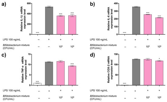 Effect of the Bifidobacterium mixture on mRNA expression levels of (a) IL-1β, (b) IL-6, (c) TNF-α, and (d) COX-2 in LPS-stimulated RAW 264.7 macrophages. Cells were pretreated with the Bifidobacterium mixture (105 or 106 CFU/mL) for 2 h, then stimulated with LPS (100 ng/mL) for 24 h. Gene expression was quantified by qRT-PCR using β-actin as the reference gene. Data are presented as mean ± SD (n = 3). Statistical significance was determined by * p < 0.05 and *** p < 0.001 compared to the LPS alone. At 24 h versus LPS alone: (a) IL-1β: mean difference = 173 (95% CI 135–212; p < 0.001) for 105 and 169 (95% CI 130–207; p < 0.001) for 106 CFU/mL; (b) IL-6: mean difference = 98.9 (95% CI 89.2–109; p < 0.001) for 105 and 140 (95% CI 130–150; p < 0.001) for 106 CFU/mL; (c) TNF-α: mean difference = 0.294 (95% CI −1.06–0.47; p > 0.05) for 105 and 1.94 (95% CI 1.18–2.70; p < 0.001) for 106 CFU/mL; and (d) COX-2: mean difference = 0.580 (95% CI −6.61–7.77; p > 0.05) for 105 and 8.11 (95% CI 0.915–15.3; p < 0.05) for 106 CFU/mL.