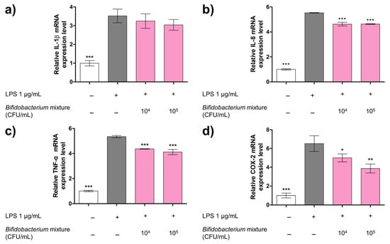 Exposure to LPS markedly elevated the mRNA levels of IL-1β, IL-8, TNF-α, and COX-2, compared with untreated control group (p < 0.001), confirming successful induction of inflammation (Figure 3). Pretreatment with the Bifidobacterium mixture produced a concentration-dependent decline in these transcripts. Although the 13.63% reduction in IL-1β mRNA did not reach statistical significance (Figure 3a), the expression of IL-8, TNF-α, and COX-2 was significantly decreased. Specifically, the Bifidobacterium mixture reduced the IL-8 expression by up to 16.33% (Figure 3b), TNF-α by up to 22.91% (Figure 3c), and COX-2 by up to 40.67% (Figure 3d).