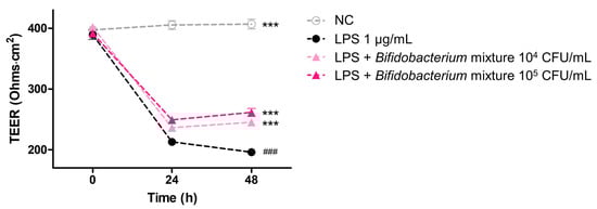 Change in barrier integrity measured as TEER in Caco-2 cells co-culture with PMA-differentiated THP-1 cells over 48 h. Co-cultures were pretreated for 6 h with medium alone (NC; ○), LPS (1 µg/mL; ●), LPS plus Bifidobacterium mixture at 104 CFU/mL (▲), or LPS plus Bifidobacterium mixture 105 CFU/mL (▲), and TEER was recorded at 0, 24, and 48 h. Data are shown as mean ± SD (n = 3). Statistical significance was determined by ### p < 0.001 compared to 0 h of the LPS alone and *** p < 0.001 compared to the 48h of the LPS alone. At 48 h: NC vs LPS, mean difference = 211 Ω·cm2 (95% CI 195–226), p < 0.001; LPS vs LPS + 104 CFU/mL, mean difference = 49.2 Ω·cm2 (95% CI 33.7–64.7), p < 0.001; LPS vs LPS + 105 CFU/mL, mean difference = 65.4 Ω·cm2 (95% CI 49.9–80.9), p < 0.001.