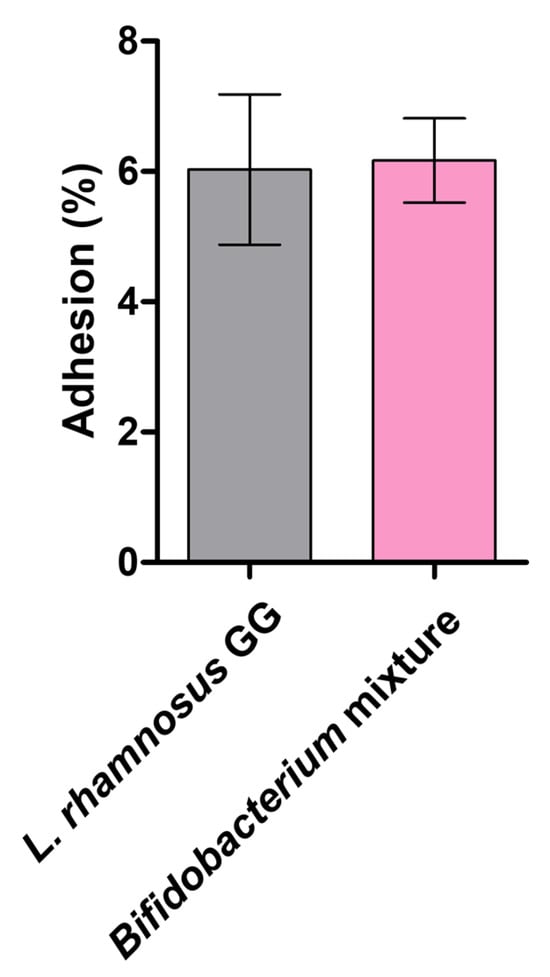Caco-2 cells were seeded on 6-well plates at 5 × 105 cells/well and cultured at 37 °C in 5% CO2 until a confluent monolayer was obtained. The Bifidobacterium mixture (108 CFU/mL) and L. rhamnosus GG (108 CFU/mL) were then added to fully differentiated Caco-2 cells and incubated for 2 h at 37 °C. After incubation, wells were gently washed twice with PBS to remove unbound bacteria. Caco-2 cells and adhered bacteria were detached using 0.1% (v/v) Triton X-100 solution, and serial dilutions were plated on Briggs-liver agar for the Bifidobacterium mixture and on MRS agar for L. rhamnosus GG; the plates were incubated at 37 °C for 48 h under anaerobic conditions. Adhesion (%) was calculated according to Equation (5).