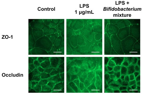 Effect of the Bifidobacterium mixture on the localization of ZO-1 and occludin in Caco-2 cells. Caco-2 cells were treated with the Bifidobacterium mixture prior to LPS stimulation. The localization of ZO-1 and occludin was visualized by IF microscopy. Images are representative of three independent experiments (n = 3). Scale bar = 20 μm.