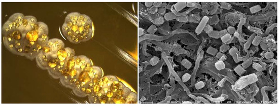 Morphological characteristics of Streptomyces sp. CACIS-1.16CA. (Left) Colonies with droplets of secondary metabolites. (Right) Spore morphology observed via scanning electron microscopy.