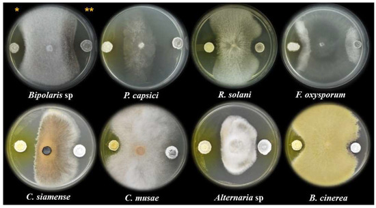 Plant diseases induced by pathogenic microorganisms affect plant health and pose a serious obstacle to the production of food [5]. Chemical fungicides have been used for years to regulate and control fungal diseases. However, the uncontrolled use of these chemical fungicides causes serious damage to the wellbeing of humans, animals, and the environment, and has led to the development of resistant strains of pathogenic microorganisms [6]. Beneficial microorganisms are considered biological control agents (BCAs) when they comprise phytopathogenic microorganisms, since they contribute to the suppression of several fungal plant pathogens. Additionally, compared with chemical fungicides, BCAs can create complex relationships with soil microorganisms, adapt to the soil and environment, and increase their efficacy and durability [7].