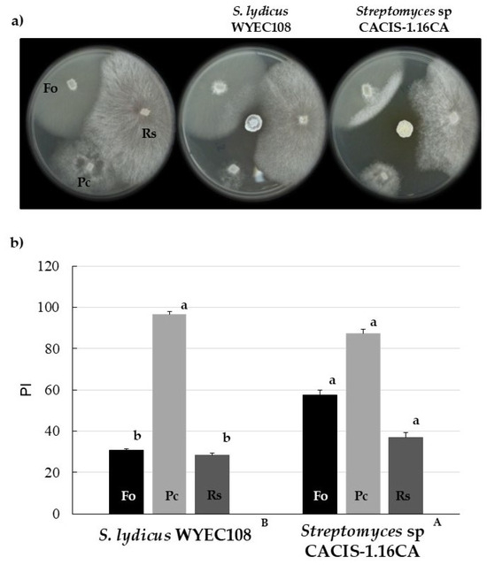 Inhibitory activities on mycelia growth from Streptomyces sp. CACIS-1.16CA and S. lydicus WYEC 108 against damping-off fungal pathogens. (a) Inhibitory effect on mycelium fungal growth after 7 days of incubation. (b) Percentage of inhibition (PI) of P. capsici (Pc), F. oxysporum (Fo), and R. solani (Rs); media values with the same letter showed non-statistical differences (p < 0.05). Uppercase letters indicate statistical differences between both Streptomyces species for the complete set of fungi; lower-case letters indicate statistical differences between both Streptomyces species for an individual fungus species.