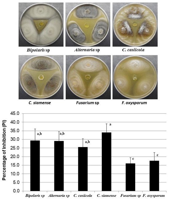Inhibition of fungal mycelium growth by diffusible compounds produced by Streptomyces sp. CACIS-1.16CA. Media values with the same letter showed non-statistical differences (p < 0.05).