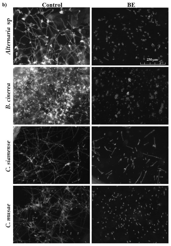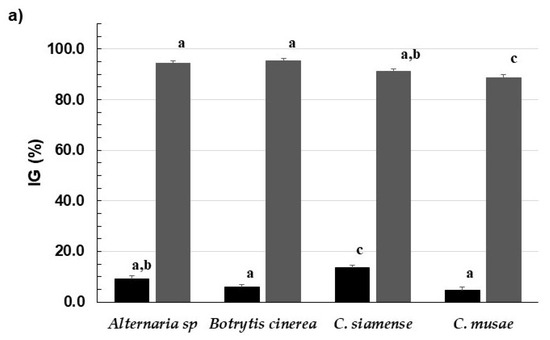 Bioactive extract effects on conidial germination. (a) Percentage of inhibition of germination (IG) of Alternaria sp., B. cinerea, C. siamense, and C. musae; black bars, control treatment (distilled water); gray bars, BE treatment. (b) Effects on conidia germination, morphology, and hyphal extension after exposure to the BE: left line, treatment without the BE; right line, treatment with the BE. Media values with the same letter showed non-statistical differences (p < 0.05).
