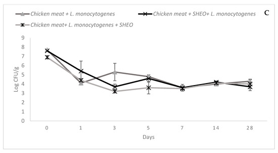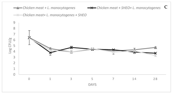 SHEO’s Anti-Listeria Effect in Vacuum Packaging: (A) vacuum packaging +4 °C; (B) vacuum packaging +10 °C; (C) vacuum packaging −20 °C.