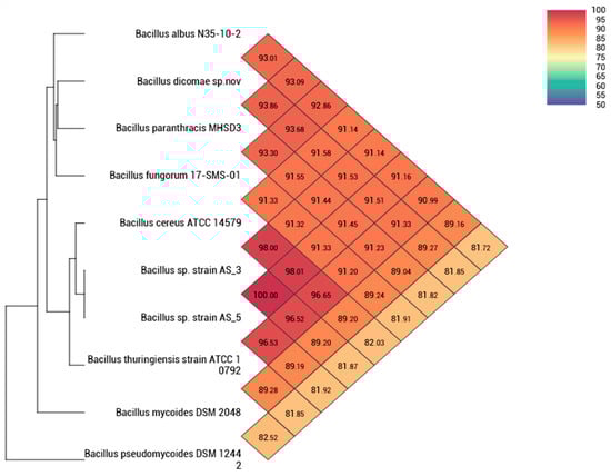 Phylogenomic classification and identification of strains AS_3 and AS_5 were determined using the Type Strain Genome Server (TYGS) (https://tygs.dsmz.de, accessed on 7 November 2024) platform. Additionally, the ANI value of strains AS_3 and AS_5 with other closely related Bacillus species was calculated using the OrthoANI tool. The phylogenetic analysis of the whole genome showed that strains AS_3 and AS_5 were closely related to Bacillus cereus type strain ATCC 14579T and Bacillus thuringiensis type strain ATCC 10792T (Tables S3 and S4). Strain AS_3 was closely related to B. cereus type strain ATCC 14579T with a DNA–DNA hybridization (dDDH) value of 85.8% and a 0.11% difference in G+C content; and B. thuringiensis type strain ATCC 10792T with a dDDH value of 71.5% and a 0.35% difference in G+C content (Table S3). Similarly, strain AS_5 was closely related to B. cereus type strain ATCC 14579T with a dDDH value of 86% and a 0.11% difference in G+C content, and to B. thuringiensis type strain ATCC 10792T with a dDDH value of 71.5% and a 0.35% difference in G+C content (Table S4). The dDDH values of both Bacillus species exceeded a recognized threshold of dDDH value > 70% as the cutoff point of species delineation [41,42]. The ANI analysis revealed that AS_3 was the closest to AS_5 with an ANI value of 100%, exceeding the species boundary threshold ANI > 95–96%, as shown in Figure 1 [43,44], which indicates that they could be the same species. Moreover, strain AS_3 had an ANI value of 98% with Bacillus cereus type strain ATCC 14579T and 96.52% with Bacillus thuringiensis type strain ATCC 10792T, whereas strain AS_5 had an ANI value of 98.01% with Bacillus cereus type strain ATCC 14579T and 96.53% with Bacillus thuringiensis type strain ATCC 10792T, which were above the species threshold values. In contrast, strains AS_3 and AS_5 had an ANI value of 91.44% and 91.45% with B. fungorum 17-SMS-01, respectively.