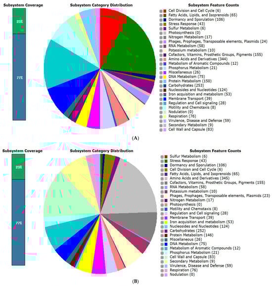 Functional categorization of coding sequences in the genomes of (A) Bacillus cereus AS_3 and (B) Bacillus cereus AS_5 based on SEED subsystem classification. Color schemes are automatically assigned by the SEED Viewer and may vary between strains.