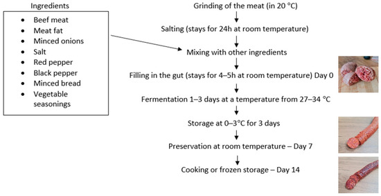 The traditional sausage was analyzed in three different stages of production and storage, specifically, on day 0 (before the drying process), day 7 (after drying/fermentation), and day 14 (after two weeks of storage) at a temperature of +4 °C, two samples per stage and 2 repetitions (n = 2). During the sample collection, we gained detailed information from traditional sausage producers about the ingredients/preparation methods of traditional sausage. This type of traditional meat product was manufactured by traditional methods without adding any starter culture. All samples were transferred to the sterile plastic pouches and kept refrigerated until analysis in the laboratory.