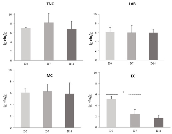 An evaluation of the microbiota present in the traditional sausage samples during production and ripening is summarized in Figure 2. The environmental temperatures involved in the sausage production and storage ranged from 0 °C during refrigeration to 34 °C during fermentation. On day 0 (pre-ripening phase), the average TNC was 7.06 ± 0.12 lg cfu/g, LAB 6.11 ± 1.01 lg cfu/g, MC 5.63 ± 0.33 lg cfu/g, and EC 5.10 ± 0.49 lg cfu/g. The main changes in bacterial populations appeared on day 7 of storage (after fermentation), including the increase in TNC to 8.88 ± 2.27 lg cfu/g, LAB 6.01 ± 1.59 lg cfu/g, and MC 5.69 ± 1.46 lg cfu/g. At this stage, there was a significant change (p < 0.05) for the EC group (2.47 ± 1.37 lg cfu/g), compared to day 0. After 14 days of sausage storage at +4 °C, the numbers of mesophilic bacteria and LAB had slight decreases to 6.68 ± 2.22 lg cfu/g and 5.99 ± 0.74 lg cfu/g, respectively, and the number of MC (5.30 ± 2.22 lg cfu/g) was approximately the same as on day 7. While EC during traditional sausage fermentation decreases up to 1.60 ± 1.62 lg cfu/g, LAB, from day 0 to day 14, did not show any significant changes.