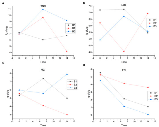 Dynamics of key microbial groups during the production and storage of traditional sausage: (A) Total number of colonies (TNC; total mesophilic aerobic count), (B) Lactic acid bacteria (LAB), (C) Micrococcaceae (MC), and (D) Enterobacteriaceae and coliforms (EC). The trends are shown for three independent production batches (B1, B2, and B3) sourced from different butchers.