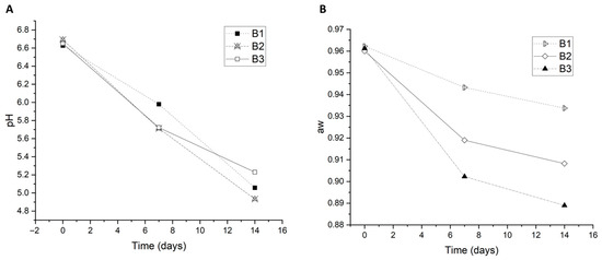 Time-course changes in physicochemical parameters critical for sausage safety and quality. (A) pH values show a characteristic decline over time, with product B3 exhibiting the most pronounced acidification. (B) Water activity (aw) gradually decreases during storage, indicating a loss of moisture. Data points represent mean values from three independent samples per batch (B1, B2, and B3).