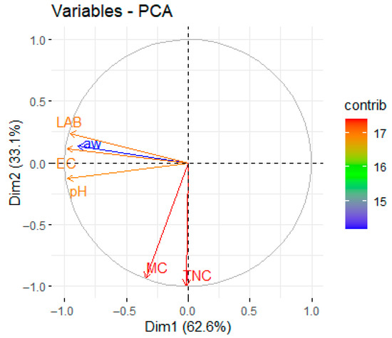 The maximal Euclidean distance between LAB and EC mirrors previous observations in fermented meats, underscoring fermentation’s role as a biological preservative. Notably, an orthogonal projection highlights the role of EC as an independent hurdle—consistent with Leistner’s hurdle technology framework [61]—demanding targeted control strategies (e.g., humectant optimization) beyond acidification. Such predominance initiates the evidence in the orthogonal projection of aw related to fermentation variables. Orthogonality implies a lack of dependence upon a general fermentation-independent effect, reinforcing that specified selection (e.g., humectants or drying methods) is required in the control for adequate food safety outcomes. The principal component loadings obtained from the analysis are presented in Supplementary Table S1.