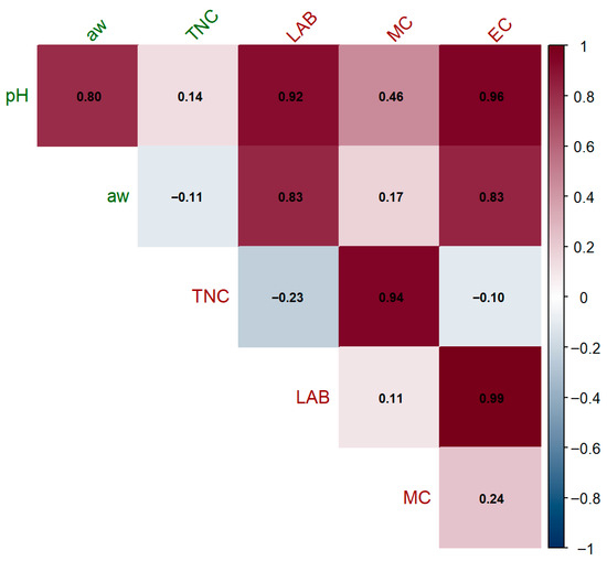 Correlogram showing Pearson correlation coefficients among microbial and environmental parameters: water activity (aw), electrical conductivity (EC), lactic acid bacteria count (LAB), moisture content (MC), pH, and total number of colonies (TNC). The lower triangle displays pairwise Pearson correlation coefficients (r-values), and the color gradient indicates the strength and direction of the correlation (dark red: strong positive; dark blue: strong negative). Correlation significance was assessed using the two-tailed Pearson test in RStudio (p < 0.05).