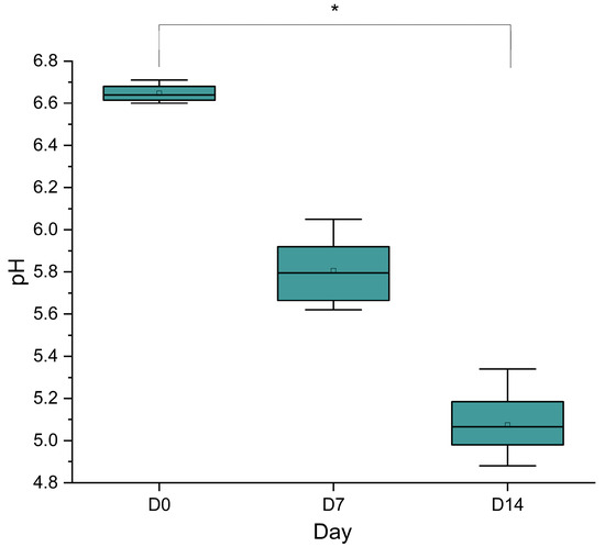 Data are presented as box plots indicating the distribution, median, interquartile range, and variability of pH measurements at each time point. Statistical analysis was performed using one-way analysis of variance (ANOVA), followed by post hoc testing to assess differences between time points. A significant decrease in pH was observed from day 0 to day 14 (p < 0.05), indicating acidification during storage. * p < 0.05.