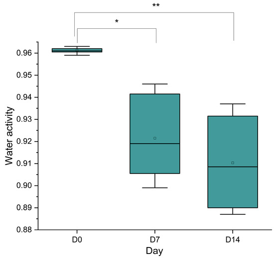 Box plot showing changes in water activity (aw) in traditional sausages at three stages of production and storage: day 0 (D0), day 7 (D7), and day 14 (D14). Data are presented as box plots illustrating the arithmetic mean (small circle), the median (horizontal line inside), the interquartile range, and variability. Statistical analysis was performed using one-way analysis of variance (ANOVA), followed by post hoc comparison. A significant decrease in aw was observed from D0 to D7 (p < 0.05), and a further reduction occurred from D7 to D14 (p < 0.05). The overall reduction from D0 to D14 was highly significant (p < 0.01), reflecting the progressive drying and dehydration of the product, which is critical for improving shelf life and ensuring microbiological safety. ** p < 0.01; * p < 0.05.