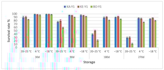 Survival rate % of freeze-dried indigenous S. cerevisiae strains during long-term storage at different conditions. Strain codes: KA-Y1, S. cerevisiae strain isolated from “Karnachalas” grapes; KE-Y1, S. cerevisiae strain isolated from “Keratsouda” grapes; BO-Y1, S. cerevisiae strain isolated from “Bogialamas” grapes. Each bar represents the mean value of three independent replicates, with error bars representing the Standard Deviation.