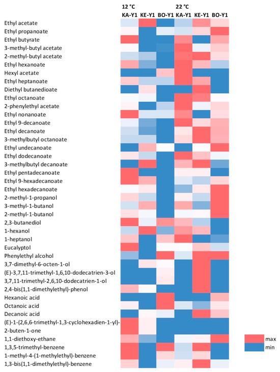 Heatmap of minor volatiles in wines fermented by indigenous S. cerevisiae strains at 12 and 22 °C. Differences in volatile concentrations are shown for each compound in blue (min) and red (max) shades. KA-Y1, wine fermented by S. cerevisiae strain isolated from “Karnachalas” grapes; KE-Y1, wine fermented by S. cerevisiae strain isolated from “Keratsouda” grapes; BO-Y1, wine fermented by S. cerevisiae strain isolated from “Bogialamas” grapes.