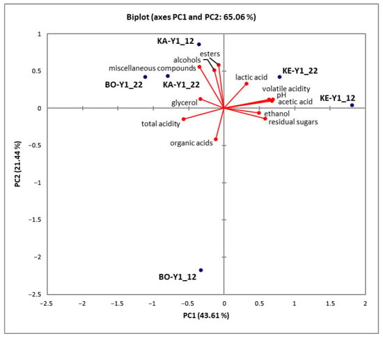 Specifically, wines produced with the KE-Y1 strain were located in the top right quadrant of the graph and (as shown previously in Table 2) were characterized by significantly higher (p < 0.05) residual sugars and acetic acid content, as well as significantly higher (p < 0.05) volatile acidity and pH values compared to wines fermented with the other strains. Similarly, wines produced by the KA-Y1 strain gathered in the top left quadrant and were associated with high concentrations of esters, alcohols, carbonyls, and miscellaneous compounds. Interestingly, wines fermented with the BO-Y1 strain at 22 °C were located close to wines fermented with the KA-Y1 strain, indicating broadly similar aromatic characteristics between these strains at 22 °C (as shown previously in Table 3). In fact, fermentation temperature is a crucial factor regarding the aromatic complexity, as fermentation at 22 °C correlated positively on PC2 for most samples (especially BO-Y1). Notably, KA-Y1_12 and KA-Y1_22 samples were closely grouped in the plot, indicating relatively stable performance of the strain in a wide temperature range (12 and 22 °C), an attribute of high importance for the wine sector.
