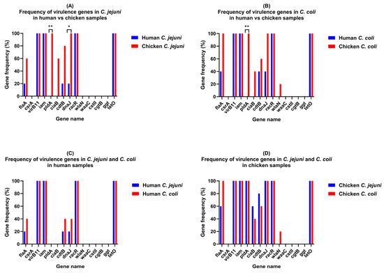 Frequency of virulence genes in C. jejuni and C. coli isolated in human vs. chicken fecal samples. (A) Frequency of virulence genes in C. jejuni in human vs. chicken samples; (B) frequency of virulence genes in C. coli in human vs. chicken samples; (C) frequency of virulence genes in C. jejuni and C. coli in human samples; (D) frequency of virulence genes in C. jejuni and C. coli in chicken samples. * mild statistical significance; ** moderate statistical significance.
