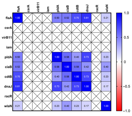 Correlation matrix of virulence gene expression in C. jejuni and C. coli isolates.