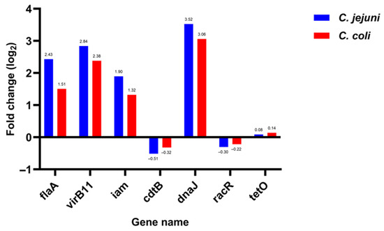 This figure depicts the log2-transformed fold change in the expression of seven virulence genes in C. jejuni and C. coli between avian and human hosts. Positive numbers signify overexpression in chickens, whilst negative values denote downregulation. The comparison underscores host-specific expression patterns that may indicate adaptive or harmful mechanisms.