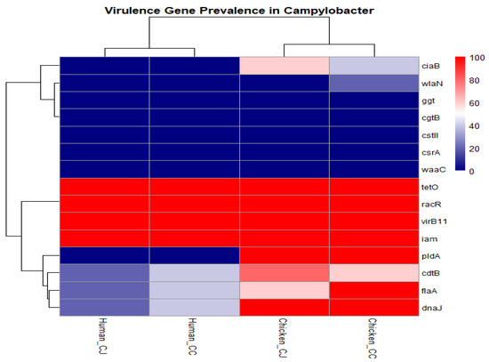 The hierarchical clustering heatmap reveals distinct virulence gene profiles in Campylobacter isolates. Chicken isolates (C. jejuni and C. coli) form a tight cluster characterized by high prevalence of invasion-associated genes (pldA, dnaJ, and cdtB; 60–100%), reflecting enhanced adaptation to chicken. In contrast, human C. jejuni and C. coli isolates cluster separately with minimal expression of these genes (0–40%), relying instead on universal core genes (virB11, iam, racR, tetO; 100% in all groups) for basic pathogenicity and tetracycline resistance. Genes like flaA show moderate activity in both hosts, while ggt, cgtB, cstII, csrAc, and waaC are universally absent. This apparent host-based clustering demonstrates Campylobacter’s adaptive specialization of virulence mechanisms, with chicken isolates evolving enhanced colonization capabilities (Figure 4).