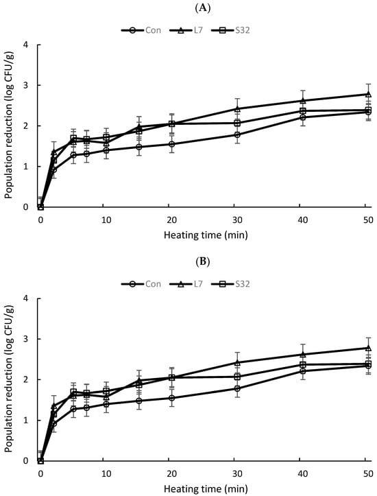 Detailed changes in the population reduction in each culture inoculated in different types of peanut products at various sampling times on TSA and BSA are shown in Figure 1A and Figure 1B, respectively. The population of Salmonella cells sharply decreased at the beginning of the heating process (2.5 min), followed by a slower reduction pace with an asymptomatic tail. When cells were enumerated on TSA, mutants L7 and S32 consistently had higher population reductions than the wildtype at every sampling time until the end of the 40 min treatment (Figure 1A). Reductions in the population of L7, S32, and the wildtype from TSA were 1.36, 1.15, and 0.92 log CFU/g, respectively, at the 2.5 min sampling point, and the population reductions continuously increased up to 2.78, 2.39, and 2.34 log CFU/g at the 50 min sampling point. On BSA similarly, mutant strains were consistently more sensitive to the heat treatments compared to the wildtype during the 50 min of treatment (Figure 1B).