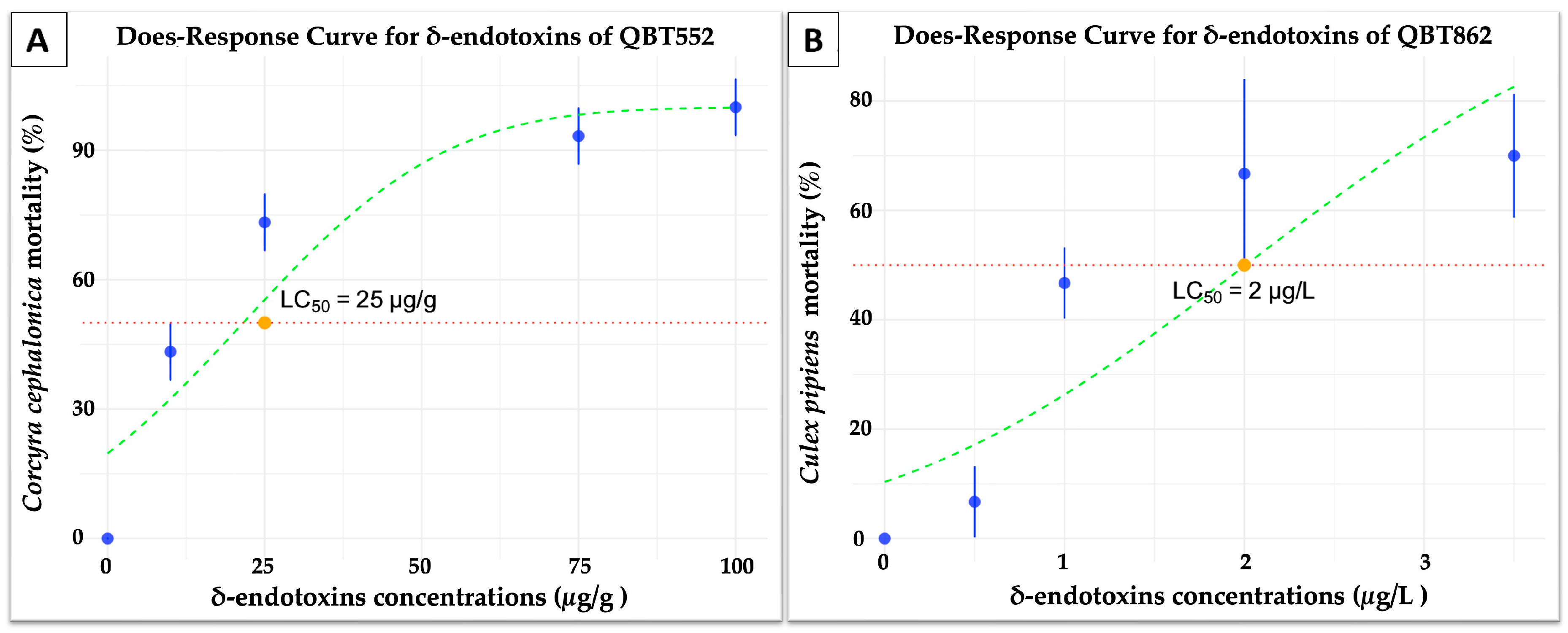 3.5. Investigation of the Insecticidal Activity of Bt δ-Endotoxins Against Corcyra cephalonica and Culex pipiens Larvae