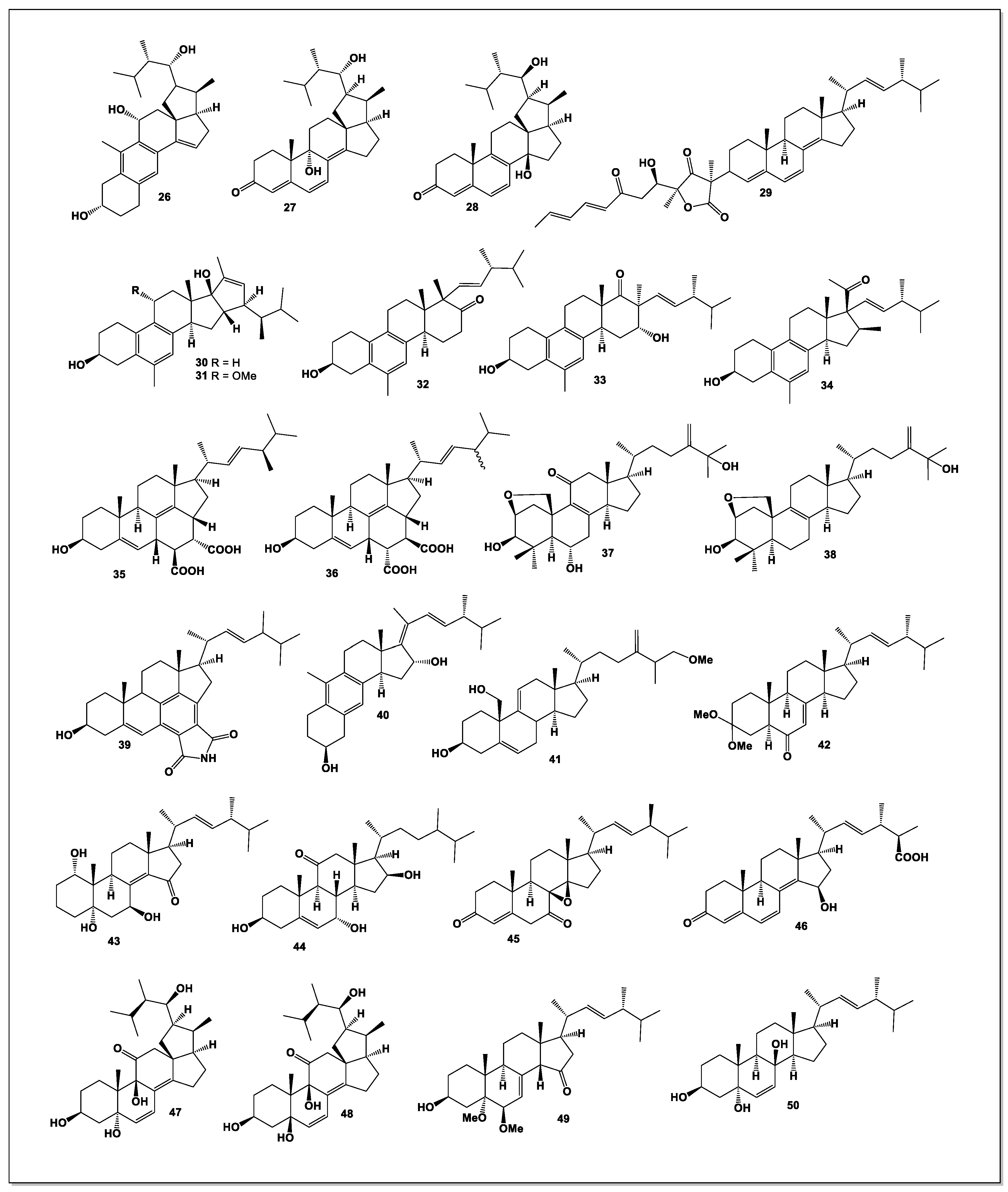 - Xia, M.W.; Cui, C.B.; Li, C.W.; Wu, C.J. Three new and eleven known unusual C25 steroids: Activated production of silent metabolites in a marine-derived fungus by chemical mutagenesis strategy using diethyl sulphate. Mar. Drugs 2014, 12, 1545–1568. [Google Scholar] [CrossRef]