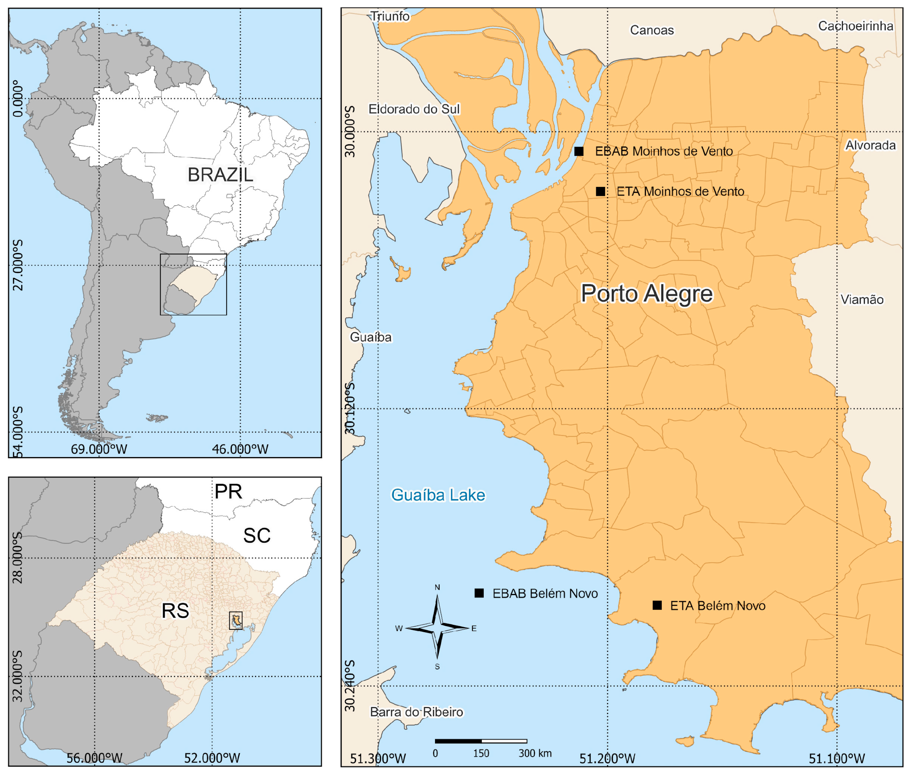 | Raw wastewater | RLS | Guaíba Lake—FEPAM Station (South) | 30.1977° S, 51.2640° W | EBAB Belém Novo 3 |