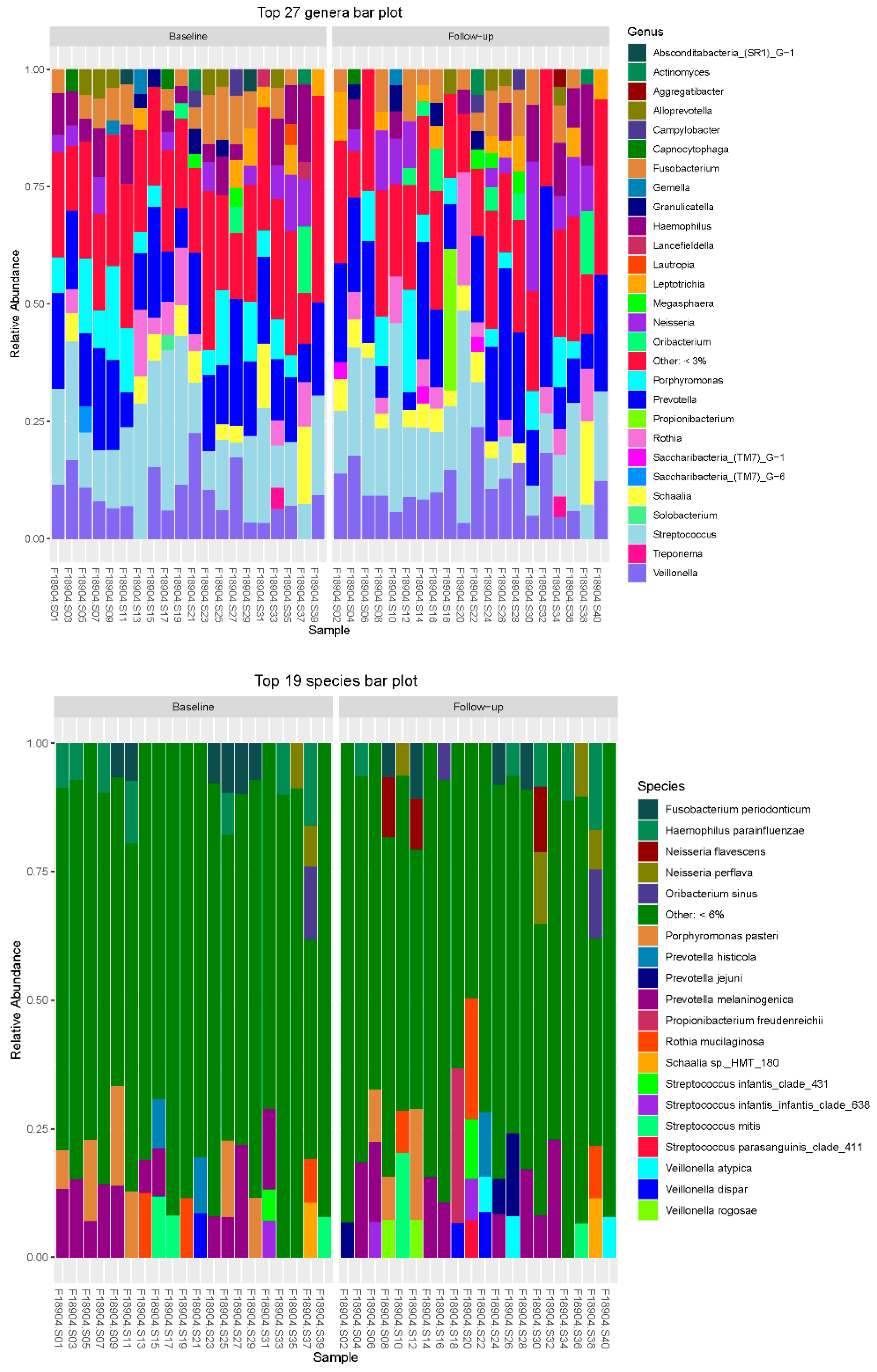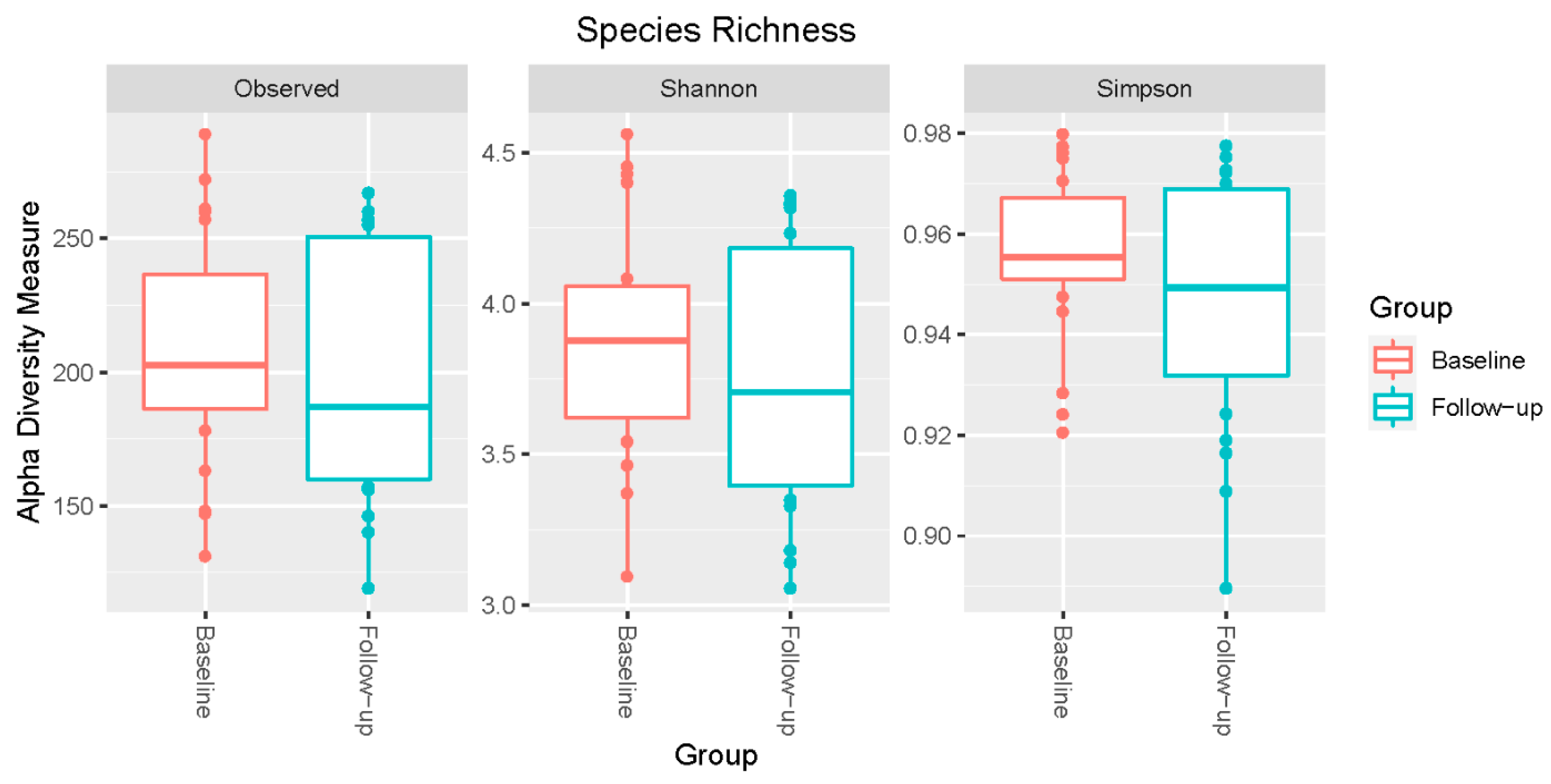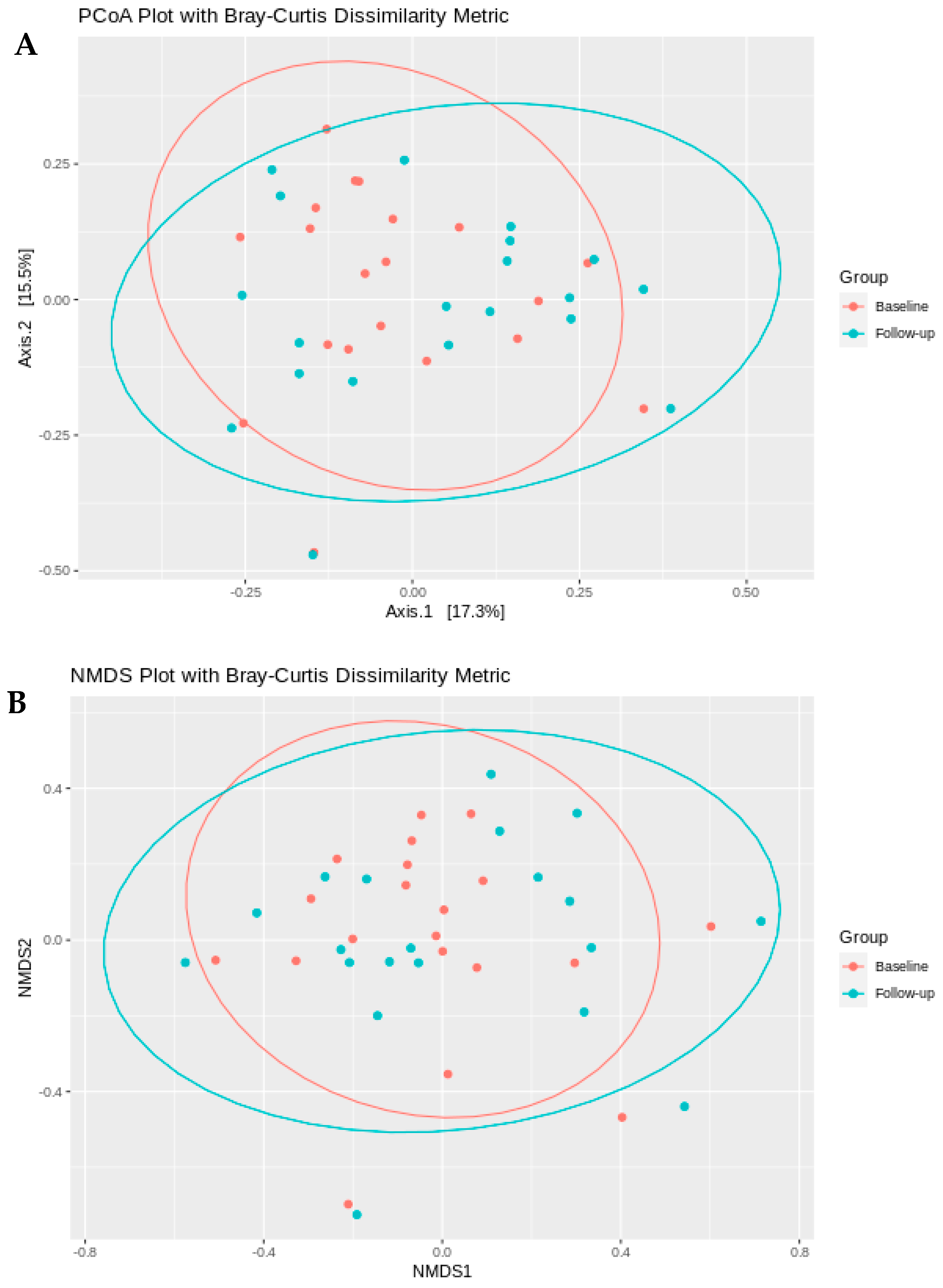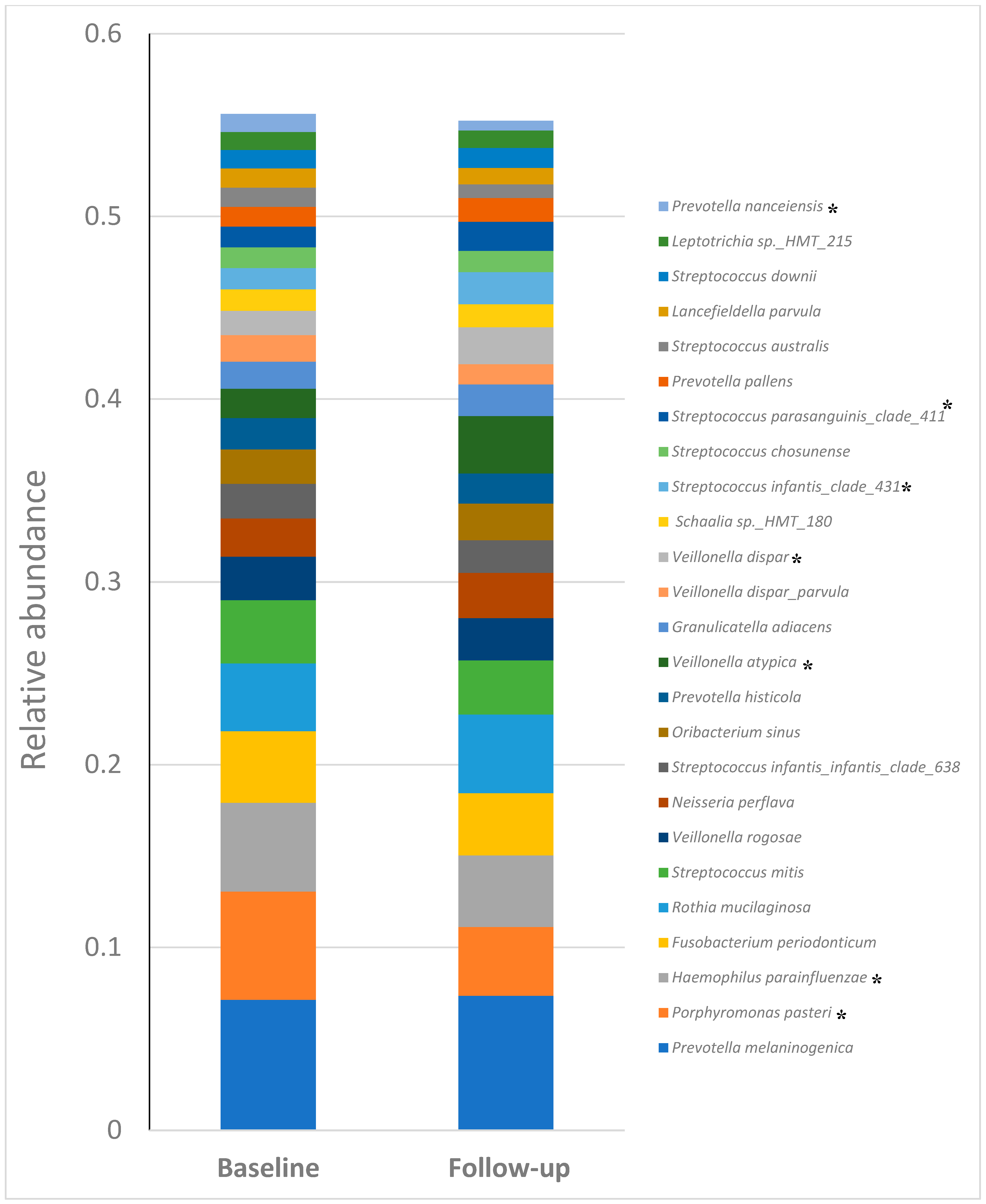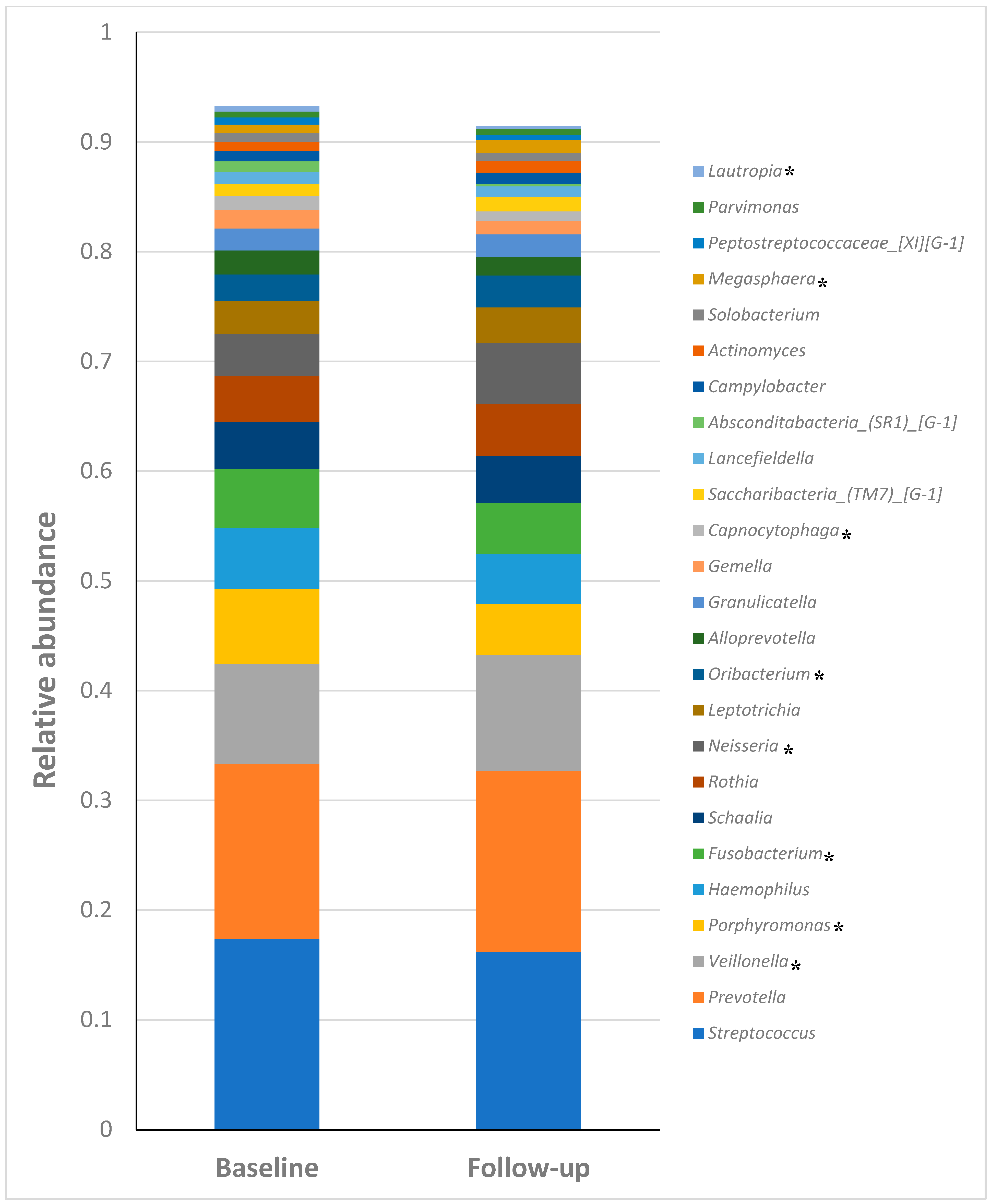 | Baseline | Follow-Up | Abundance Levels Up or Down * | p Value | |