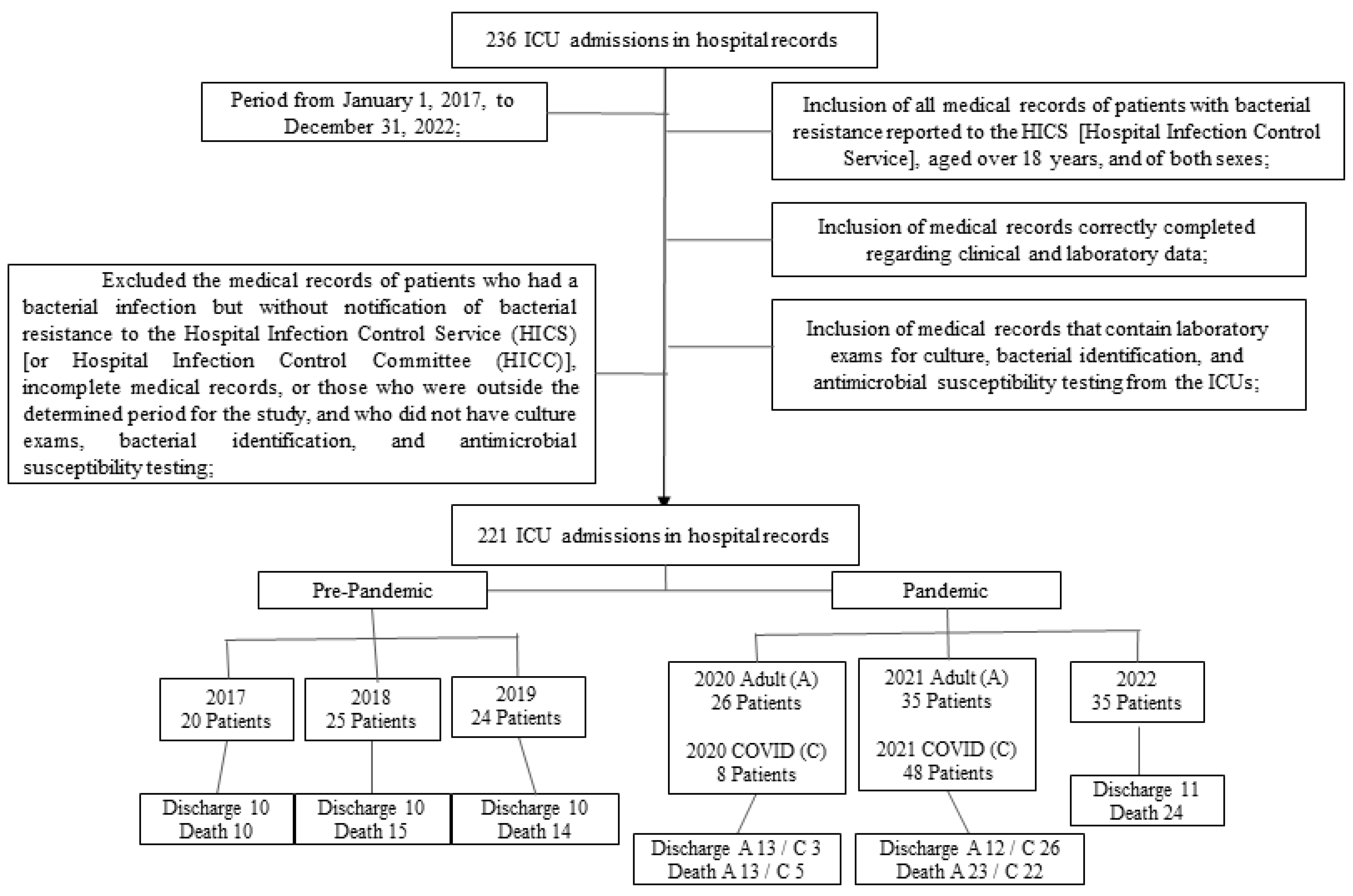 - Dias, M.L.S.; Molinaro, C.G.S.; Aragão, L.C.M.; de Lima, E.M.; Correal, J.C.D. Análise comparativa da resistência bacteriana de microrganismos causadores de bacteremia em pacientes críticos nos períodos pré-pandemia e COVID-19 em um hospital terciário privado de Rio de Janeiro. Braz. J. Infect. Dis. 2022, 26, 102227. [Google Scholar] [CrossRef]