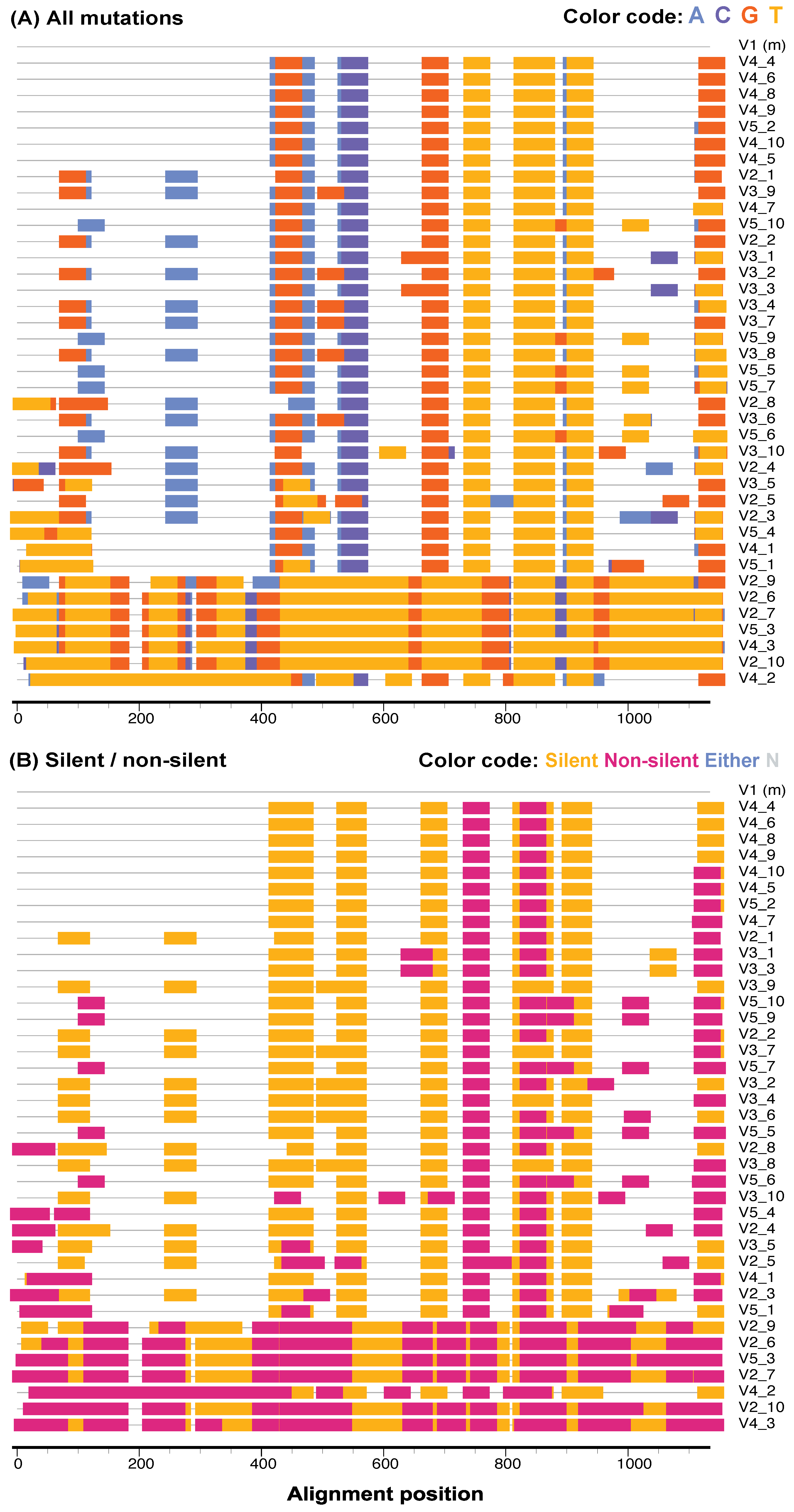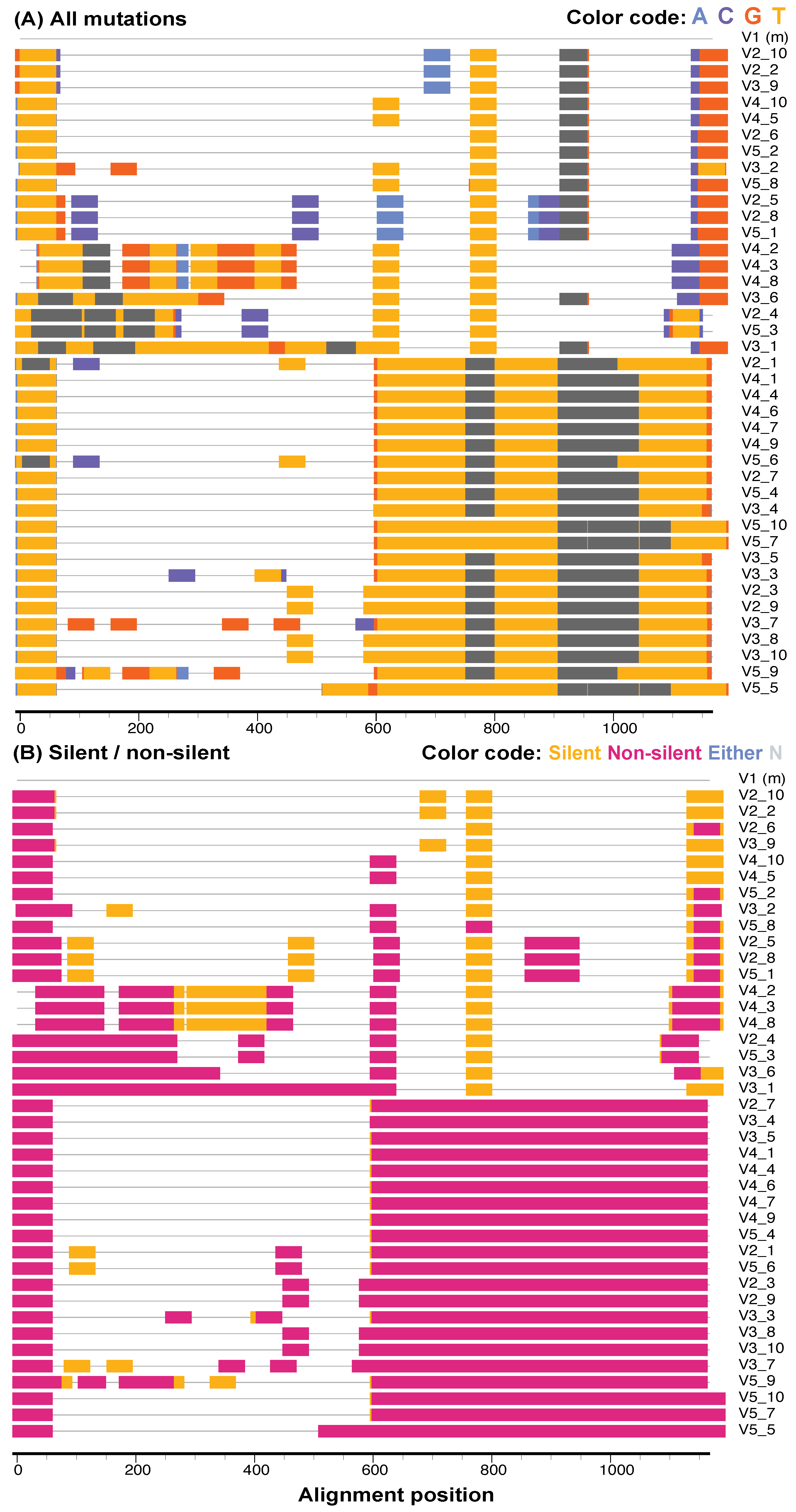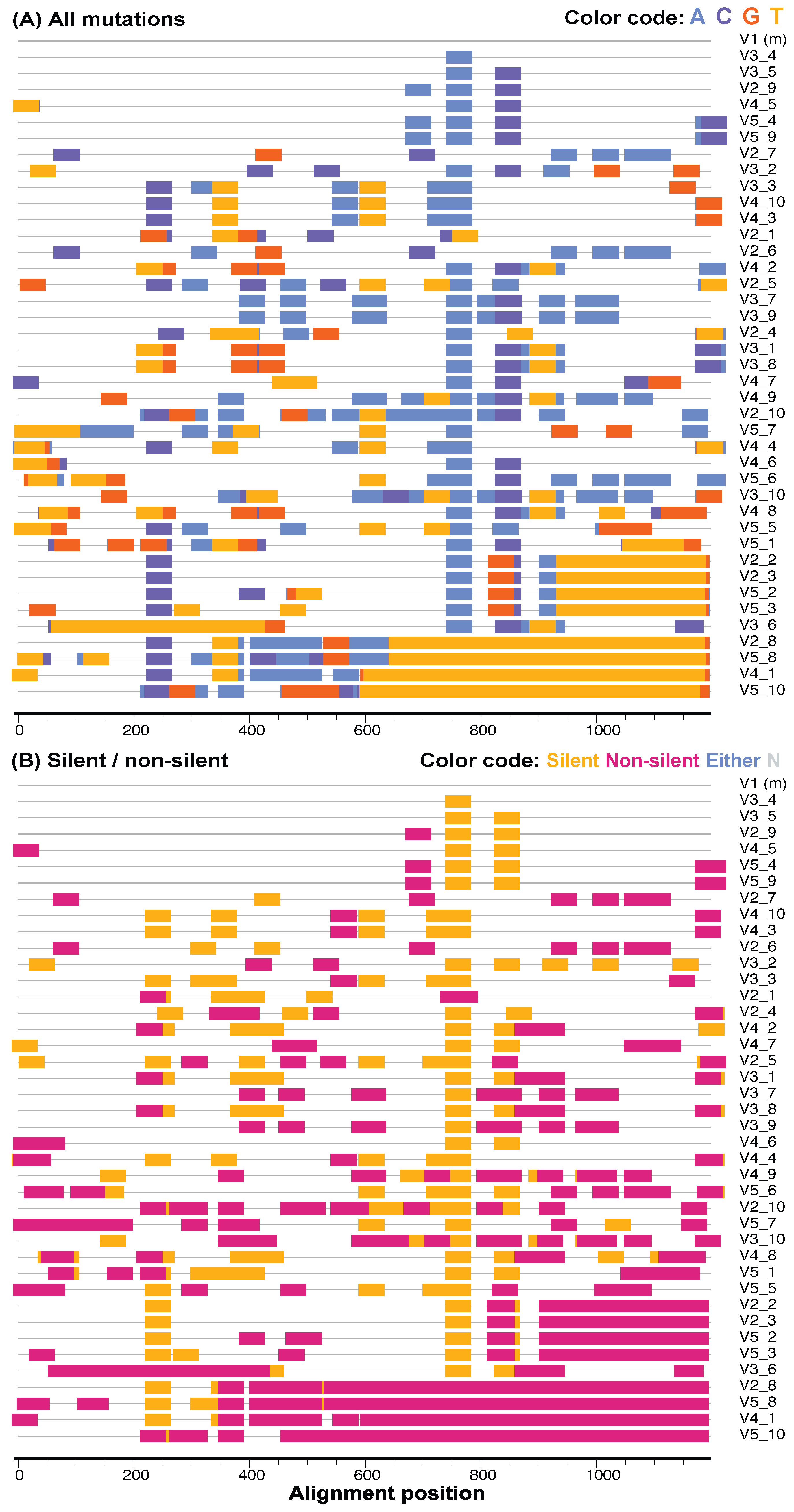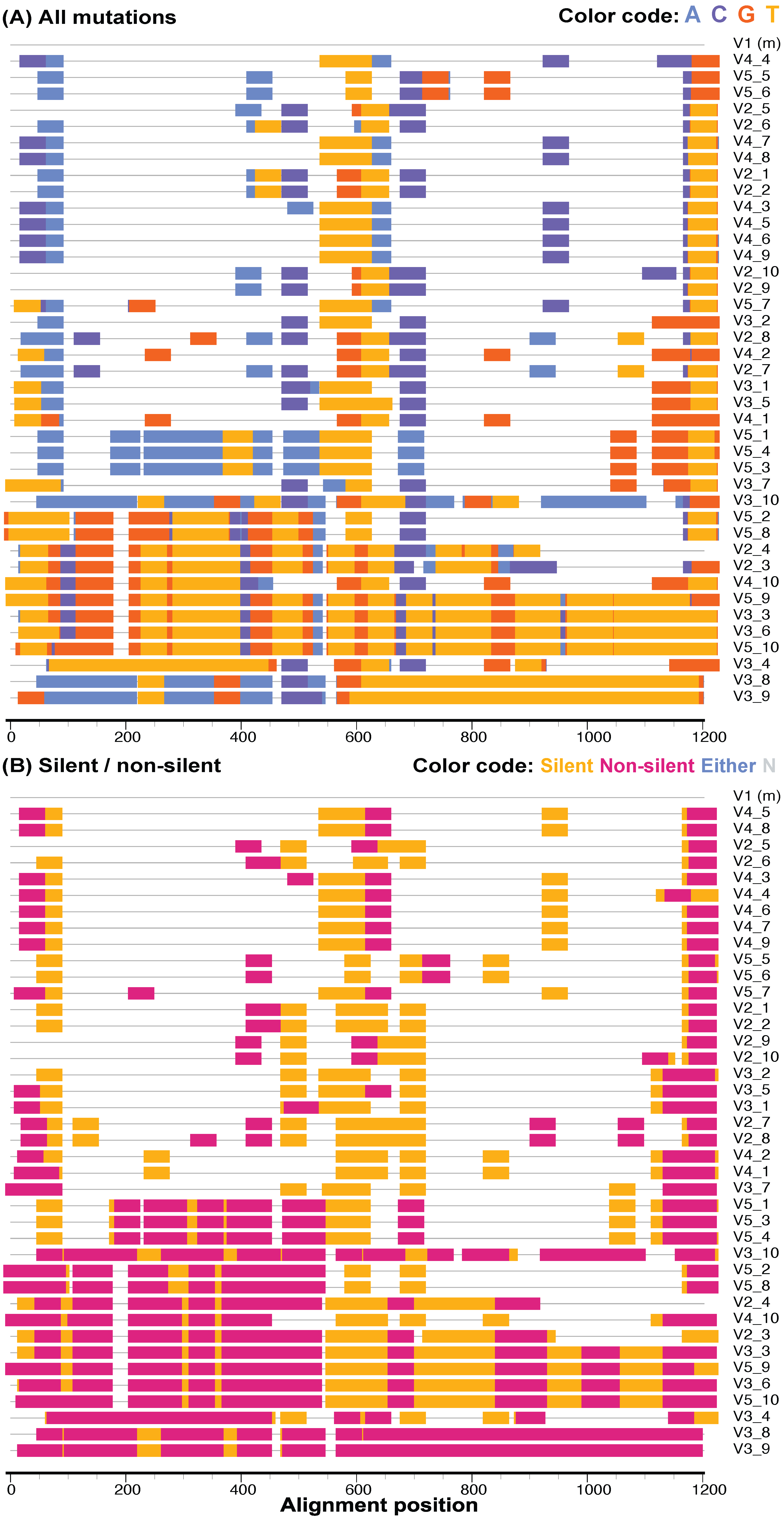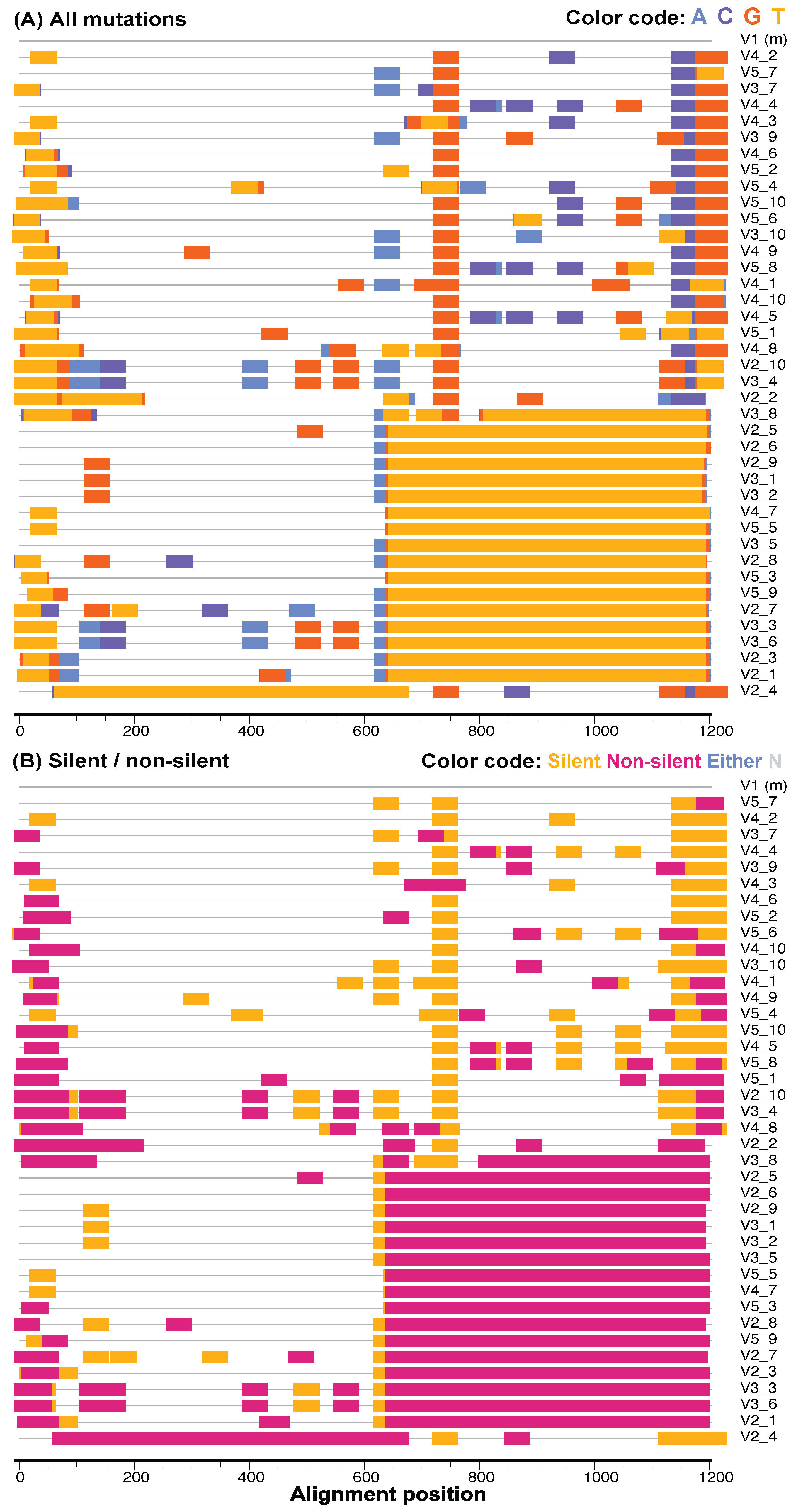 For each patient, we prepared alignments that included the V1 genome as a reference along with all sequences from subsequent visits (Supplementary Materials, alignments 1052_aligned.fasta, 1114_aligned.fasta, 1117_aligned.fasta, 2028_aligned.fasta, and 2038_aligned.fasta), and analyzed them using the Highlighter online tool [56].