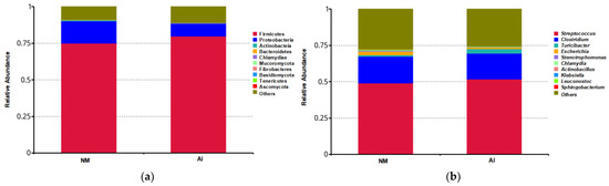 Figure 1 depicted the relative abundance of the top 10 microorganisms in the gut microbiota at the genus levels for captive male giant pandas in the NM and AI groups. The findings presented in Figure 1a revealed that the gut microbiota of captive adult male giant pandas in both the NM and AI groups were predominantly composed of Firmicutes, Proteobacteria, Actinobacteria, Bacteroidetes, and Chlamydiae at the phylum level. Significantly, Firmicutes and Proteobacteria were identified as the dominant phyla, together accounting for more than 85% of the total microbial community (Figure 1a). At the genus level, the top 10 species exhibiting the highest relative abundances in each sample of the NM group and the AI group were identical (Figure 1b). Streptococcus and Clostridium were recognized as the principal bacterial genera, jointly accounting for over 70% of the total microbial community (Figure 1b). Supplementary material presented the microbial composition of each sample (Figure S1).