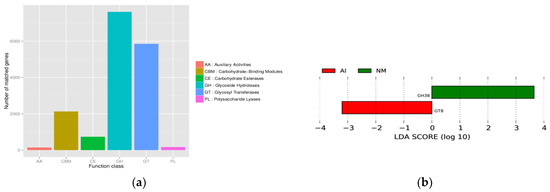 The outcomes of comparing Unigenes with the CAZy functional database using DIAMOND software (V0.9.9.110). (a) Statistical chart of CAZy functional group annotation results. Notes: In the diagram, the x-axis represents each functional module of CAZy enzymes, while the y-axis indicates the number of protein families annotated to each respective module. (b) LDA value distribution map of differential function. Notes: The bar chart of LDA value distribution illustrates the function in which the LDA score exceeds the designated threshold (default setting is 3), indicating a biomarker with significant statistical variances among different groups. The length of each bar in the chart corresponds to the magnitude of the difference function, i.e., the LDA score.