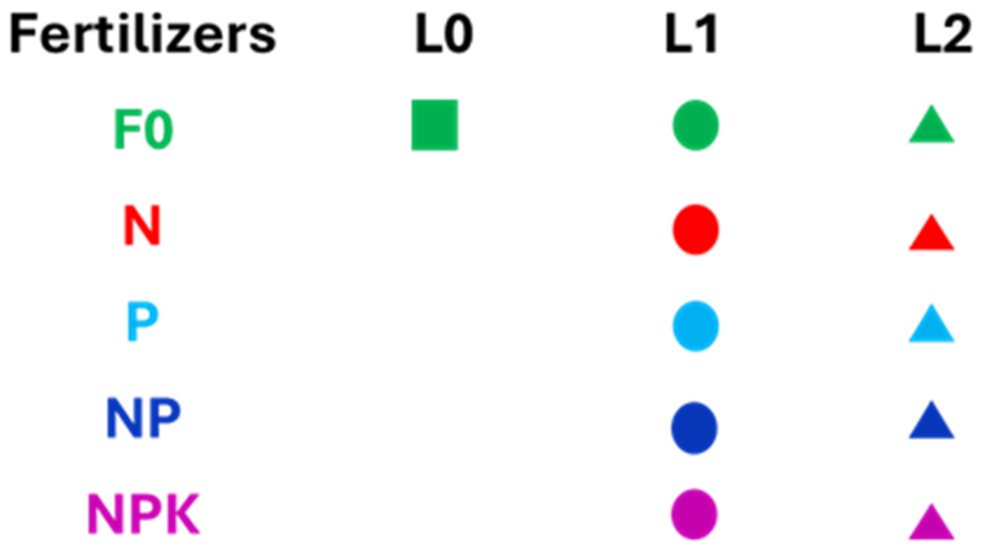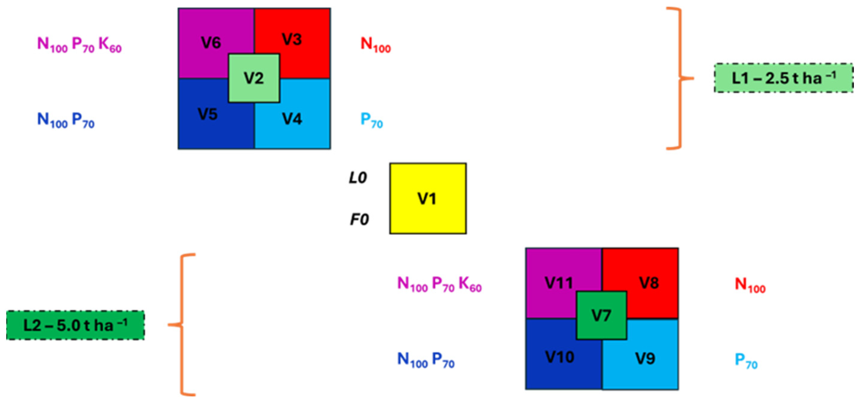 | V2 | Medium liming | L1 | 2.5 t ha−1 | F0 | 0 kg ha−1 | Medium liming, unfertilized soil |