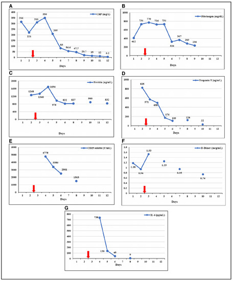 Evolution of inflammatory and cardiac parameters. (A) C reactive protein (CRP); (B) Fibrinogen; (C) Ferritin; (D) Troponin T; (E) CD25 soluble; (F) D-Dimer; (G) IL-6. Red arrow indicates the day of the administration of Tocilizumab. The last ferritin was taken on day 17 (200 ng/mL).