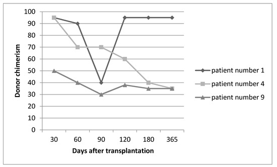 - Hill, R.S.; Petersen, F.B.; Storb, R. Mixed hematologic chimerism after allogeneic marrow transplantation for severe aplastic anemia is associated with a higher risk of graft rejection and a lessened incidence of acute graft-versus-host disease. Blood 1986, 67, 811–816. [Google Scholar] [CrossRef] [PubMed]