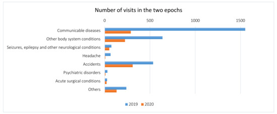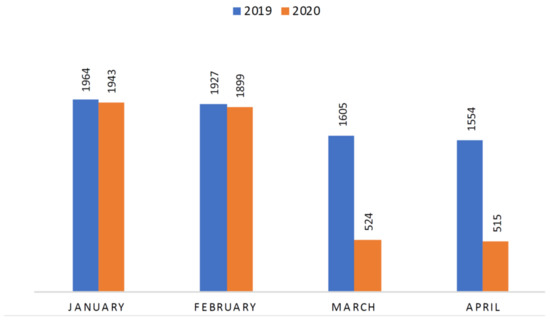 PED visits registered in January–February 2019 were similar to those observed in the same period in 2020 (3.891 vs. 3.842, respectively) (Figure 1).