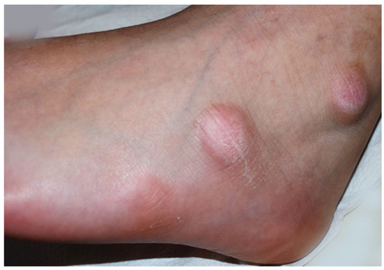 Asymptomatic firm nodules measuring 2–3 cm in diameter on the lateral aspect of the left foot.