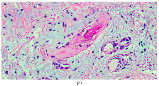 (a) The microphotograph shows orthokeratosis and mild acanthosis (acral skin), a mild lymphomonocyte infiltrate and myxoid stroma of the dermis. Hematoxylin-Eosin staining, original magnification 100×. (b) In the medial deep dermis, an ample area of edema is evident, with extensive and accentuated fragmentation or even dissolution of the collagen and elastic fibers (the latter confirmed by the Orceina staining), together with the presence of thrombotic foci in the small vessels. (Hematoxylin-Eosin staining, original magnification, 400×, with orcein staining in the insert). (c) Detail of a thrombosed blood vessel together with the presence of fibroblasts of a likely “reactive” significance around extensive, widespread dermal mucinosis. Hematoxylin-Eosin staining, original magnification 400×.