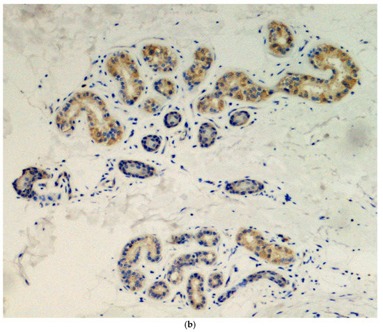 (a) Presence of viral spike proteins in the cytoplasm of epithelial cells of the secretory portion of eccrine sweat glands (brown color). Immunostaining for SARS-CoV-2, spike proteins. Original magnification 200×. (b) Presence of viral spike proteins in the eccrine sweat glands (brown stain). Immunostaining for SARS-CoV-2, spike proteins. Original magnification 400×.