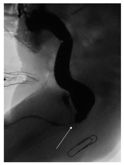 High pressure distal loopogram demonstrating recto-bulbar fistula (white arrow) and expected position of neo-anus (paper clip).