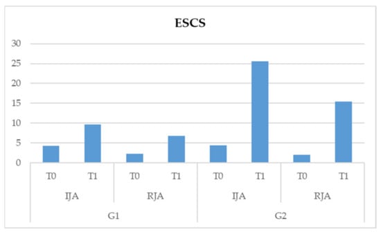 - Interaction scale * time * group is significant (F (1,82) = 161.102, p < 0.05). This data shows us that there is a significant interaction between the two subscales, those being the time and type of treatment. More specifically, both treatments show significant improvements in the two subscales of the ESCS test, but in G2, a more significant improvement in the IJA behaviors of children at T1 is noted (Table 3 and Figure 2).