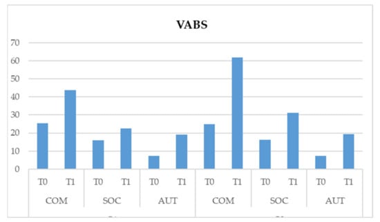 Figure 3. Effect of the scale * time * group interaction on the Vineland Adaptive Behavior Scales (VABS) test.